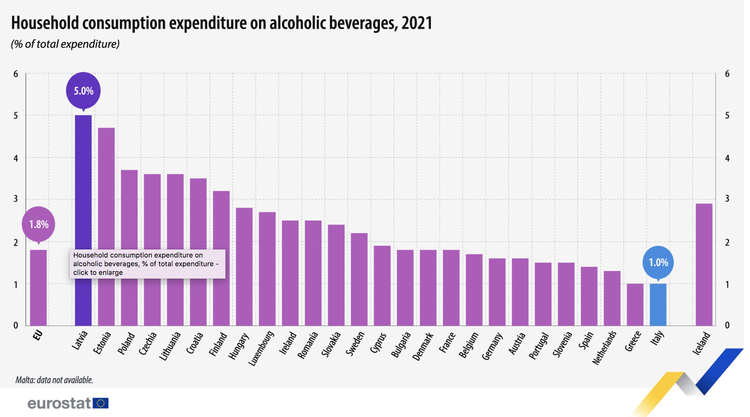The lowest shares of spending on alcoholic beverages in total consumption were in Greece and Italy (both 1.0%), the Netherlands (1.3%) and Spain (1.4%).