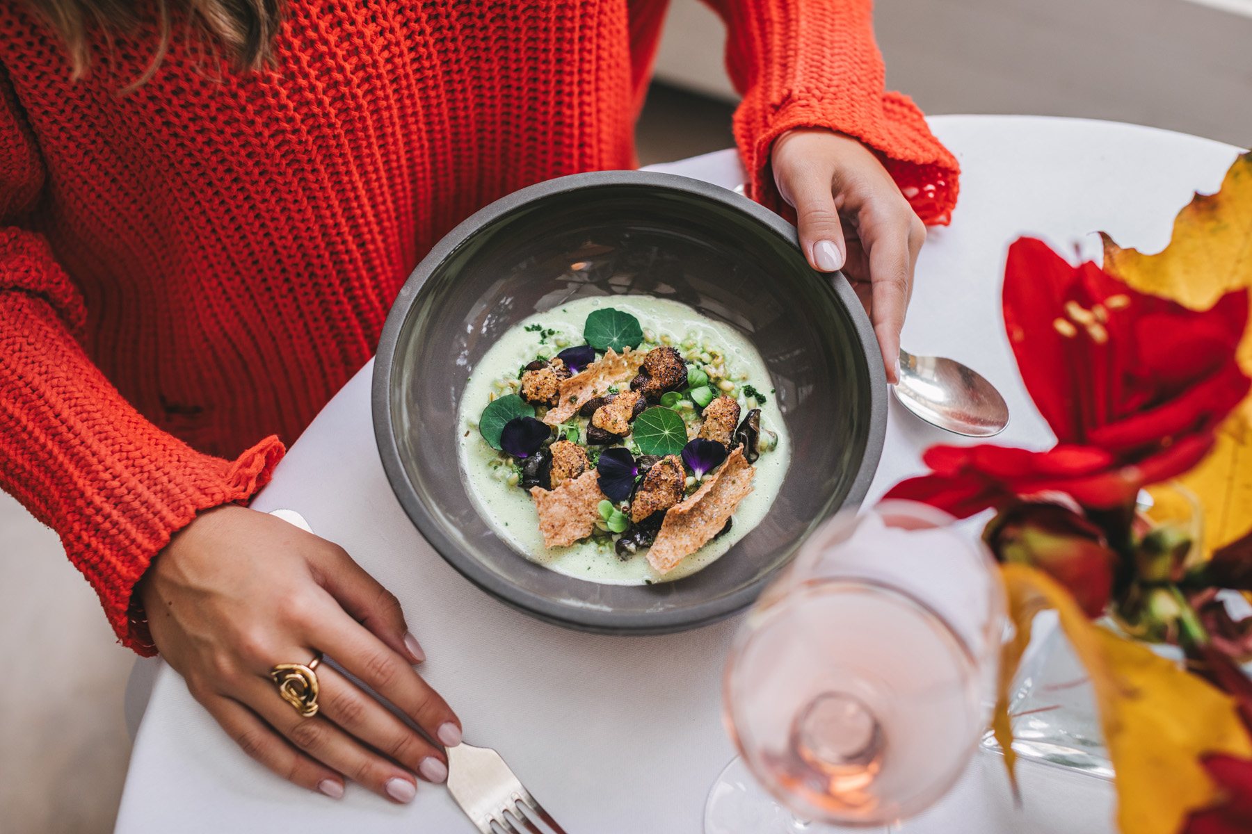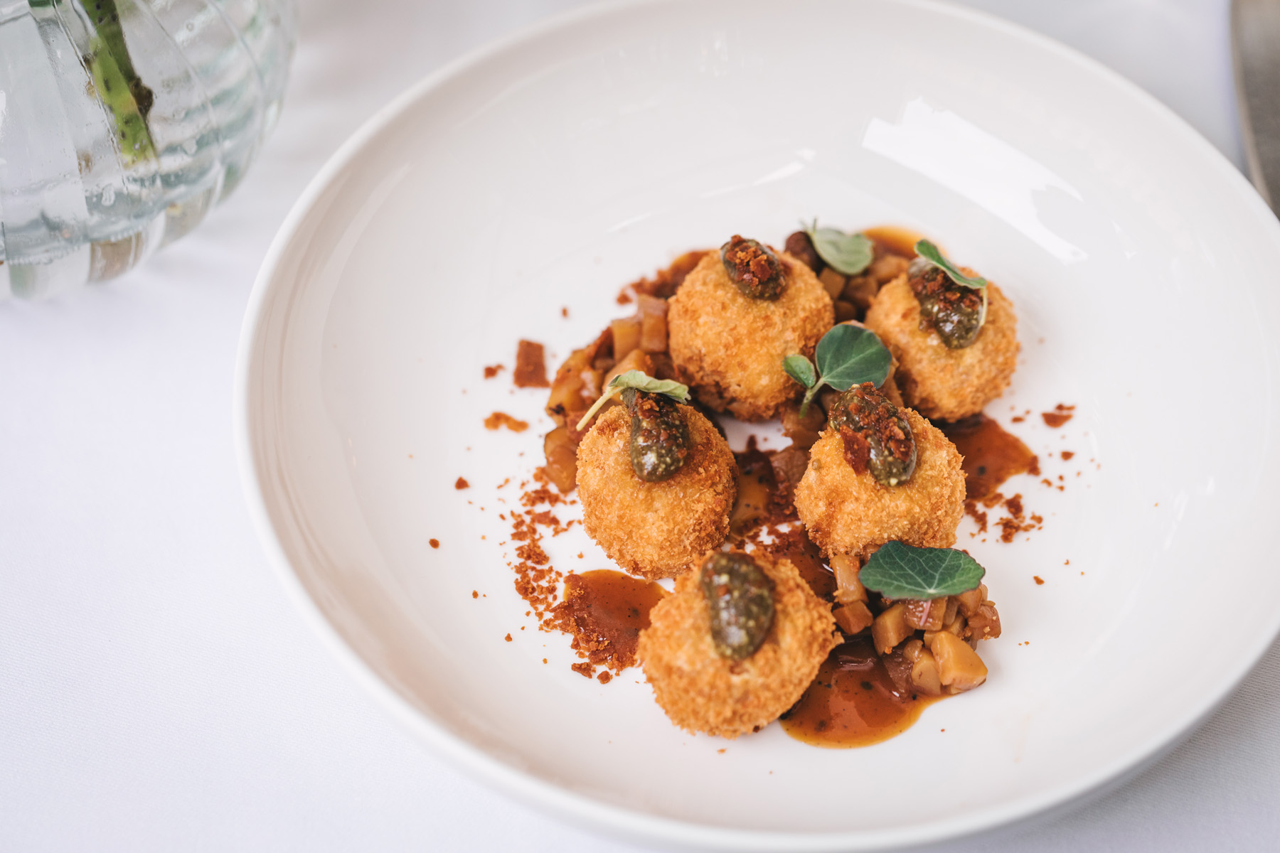 Autumn woodland flavours come through in porcini croquettes, elevated with a sunflower seed pesto, thyme and an unexpected, yet irresistible, crunchy pork crackling crumble.