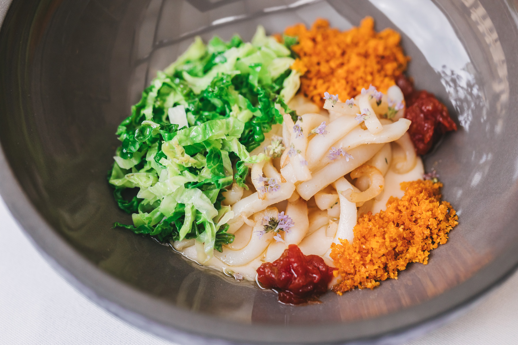 The line-up of starters continues with snails infused with anise, served alongside an orzotto enriched with herbal pesto, an airy foam, parsley powder and crisped oats.