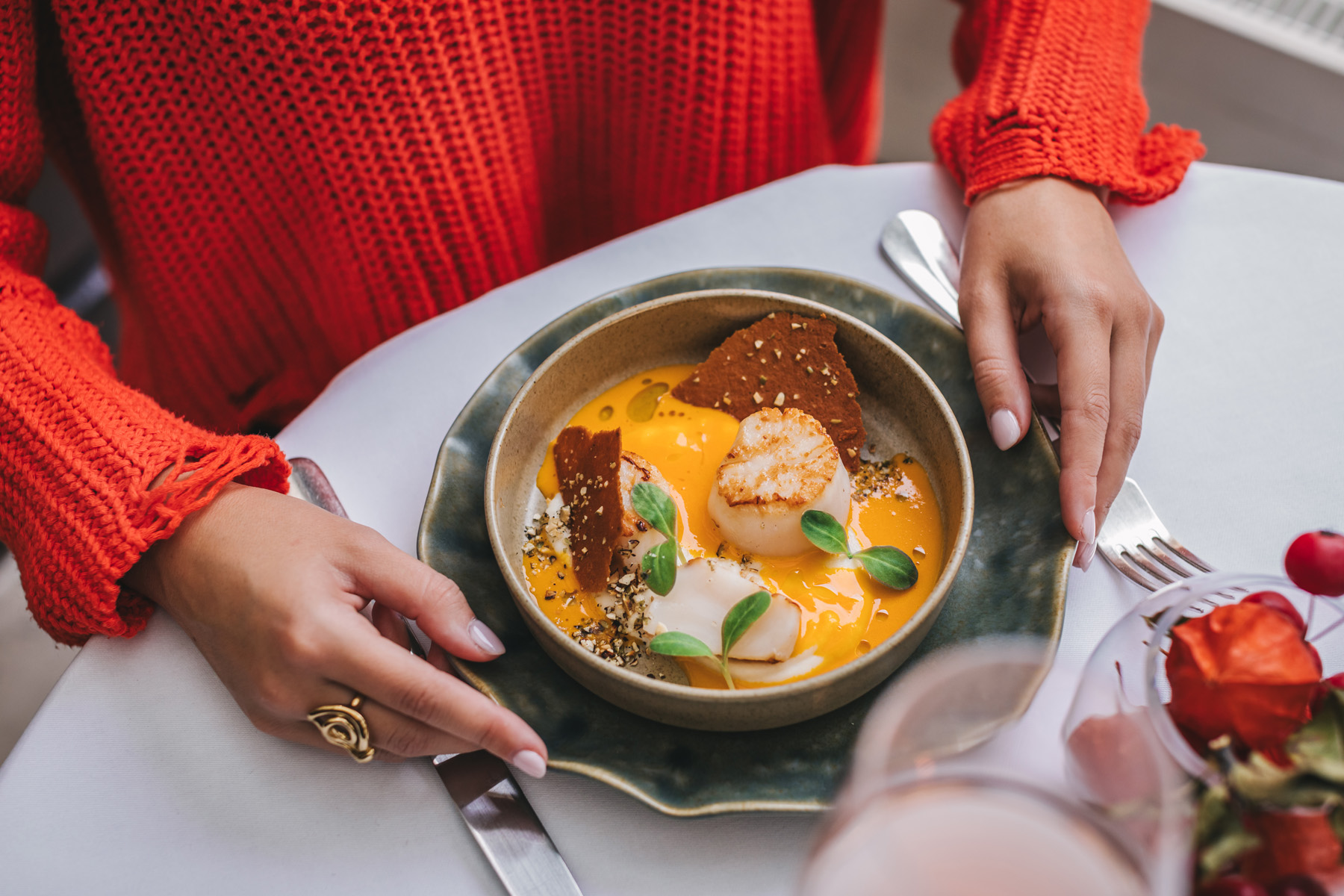 Scallops arrive nestled in a silky pumpkin and orange velouté, complemented by cauliflower cream, pumpkin seed pesto and a delicate pumpkin tuile.