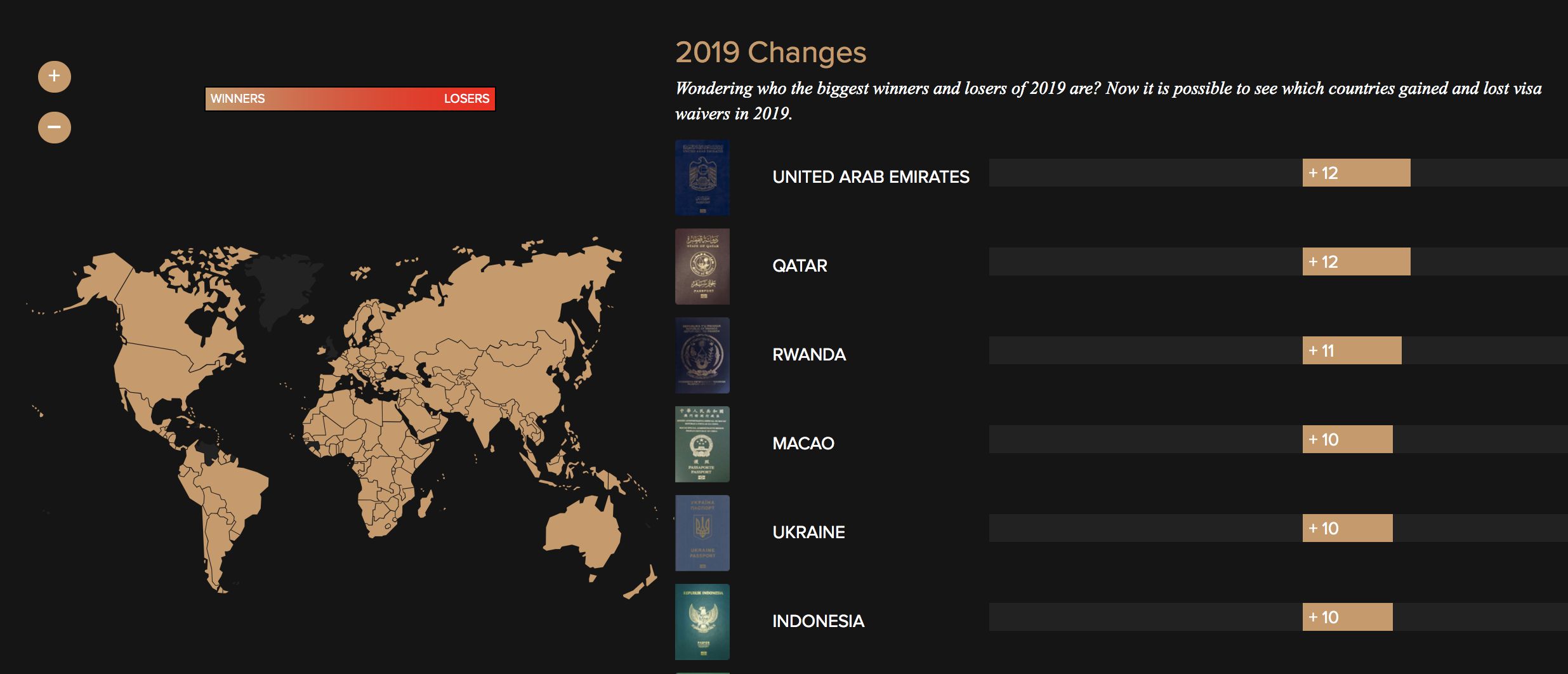 Topping the list were the passports of the United Arab Emirates and Qatar which had a net score of +12 for the number of visa waivers gained and lost in 2019. Rwanda was next with a net score of +11.