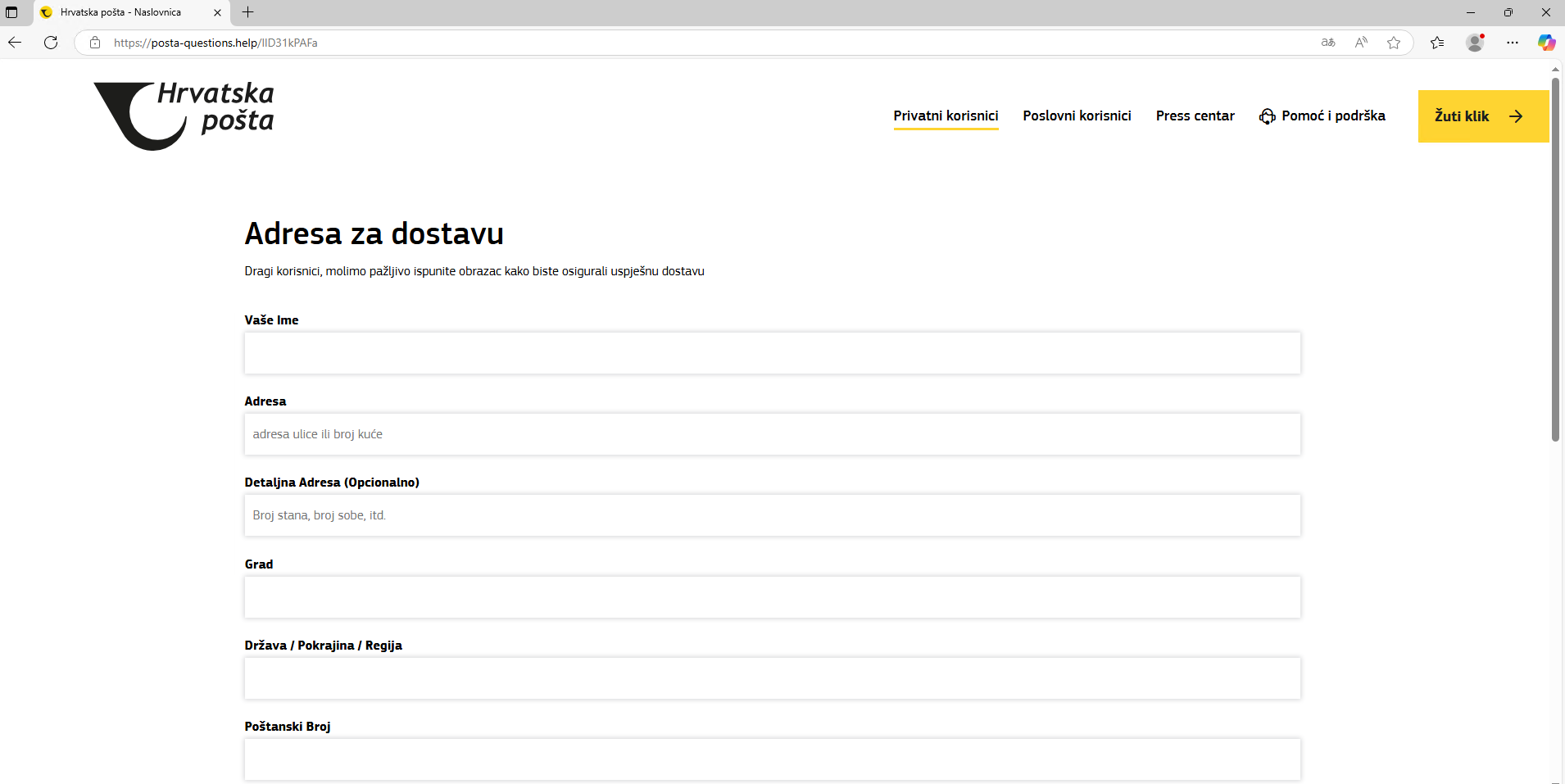Croatian Post reminds users that all legitimate notifications will include a tracking number, which can be verified via their tracking system at: https://posiljka.posta.hr.