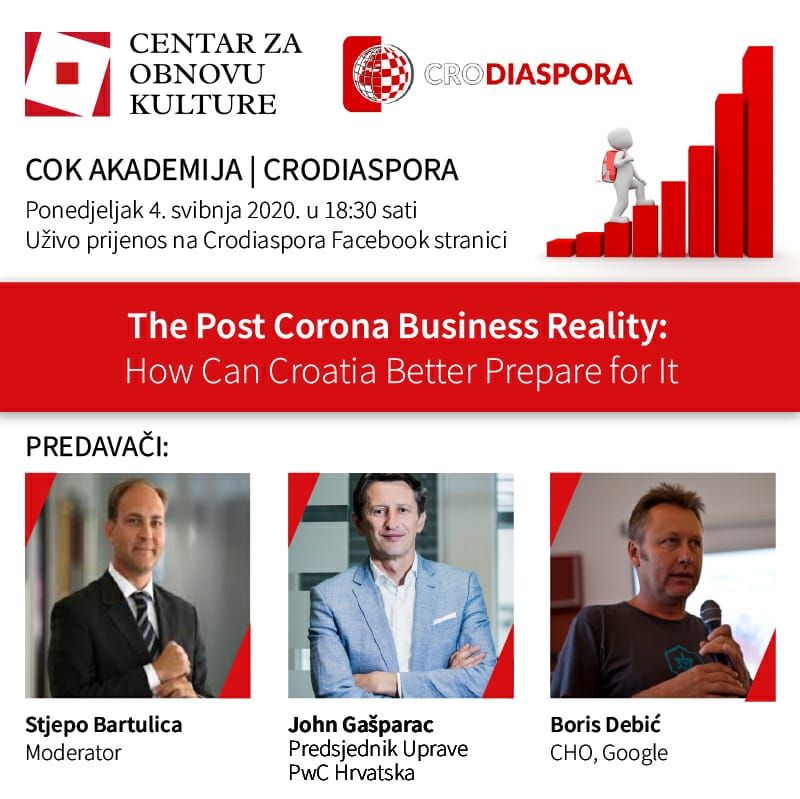 Join Crodiaspora and COK on Monday, May 4th, 2020 at 6:30 P.M Croatian time (Central European Time) for the first-ever Crodiaspora- COK online academy webinar. We are excited to host John Gašparac, Country Managing Partner at PwC Croatia and Boris Debic, CHO at Google, to discuss the opportunities and challenges for the Croatian economy in a post-Corona world.