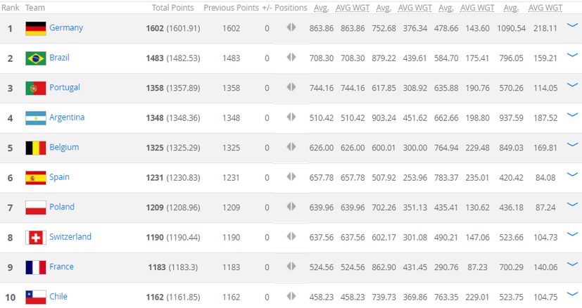 Brazil remains in second place ahead of Portugal in third place.