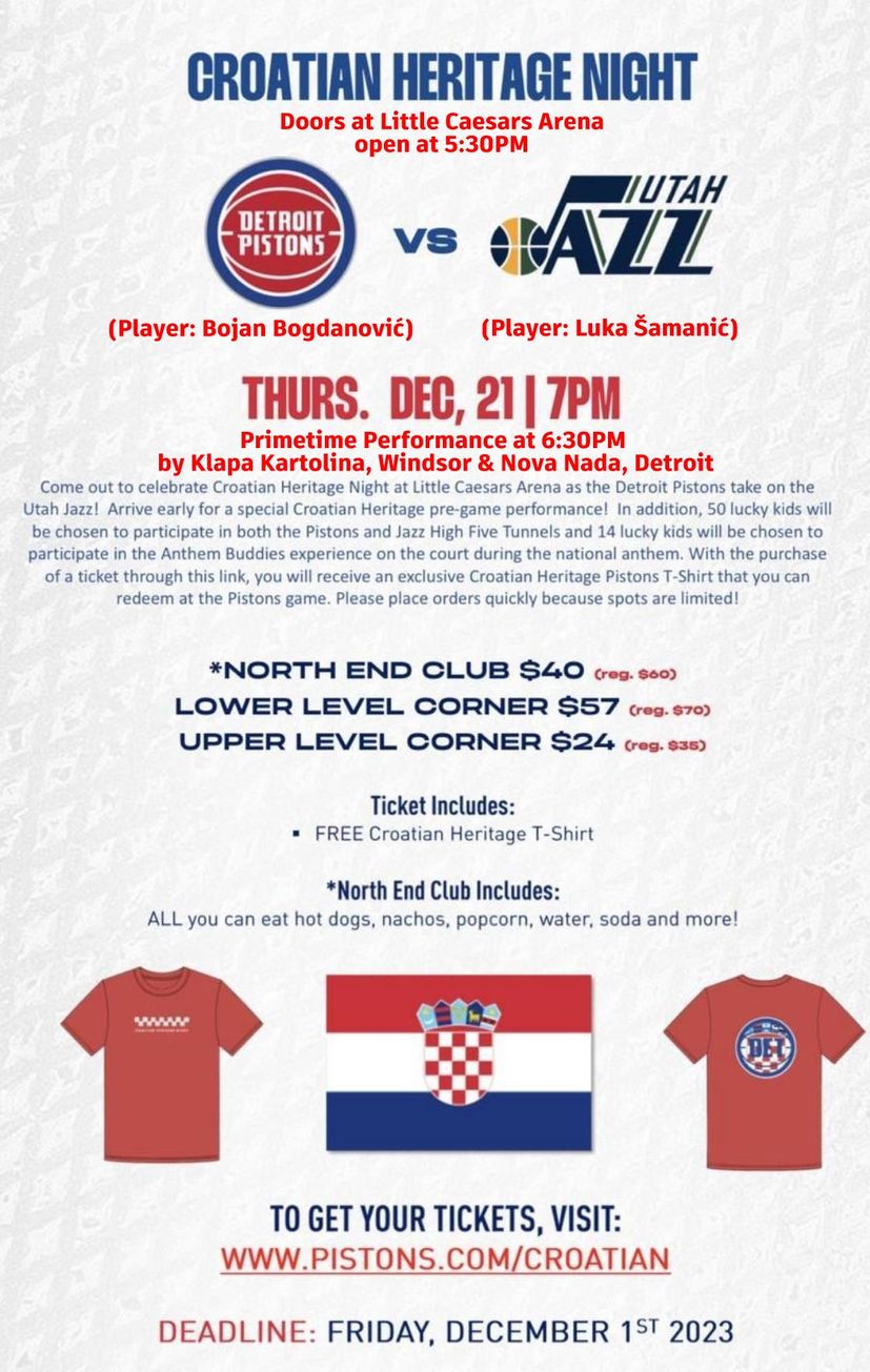 To be a part of this night, you can secure your tickets for Croatian Heritage Night 2023 today. To make your purchase, visit www.pistons.com/croatian