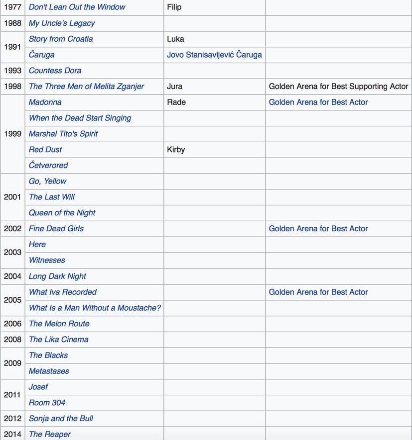 He won two Croatian Actors’ Association Awards for Šokica (1998) and Duga mračna noć (2006). In 2005 he was ranked second in the Croatian-based film magazine Hollywood in the “Best Croatian Male Movie Stars of All Time” list.