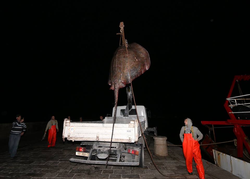 Marko and Andrija’s stingray was 3.8 metres long and 2.1 metres wide. It could not be weighed as the scales only went up to 200 kg but it was estimated to weigh between 250 and 300 kg. The stingray could hardly fit on the truck.